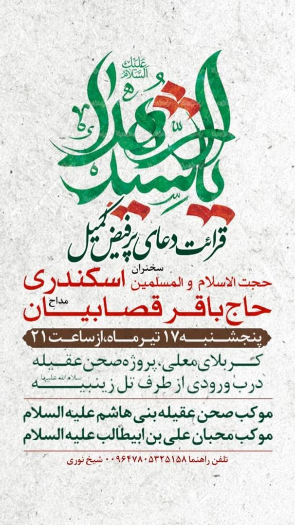 ابتدا مراسم قرائت دعای کمیل در پروژه صحن عقیله با سخنرانی حجتالاسلام اسکندری و قرائت دعا با نوای حاج باقر قصابیان برگزار خواهد شد.