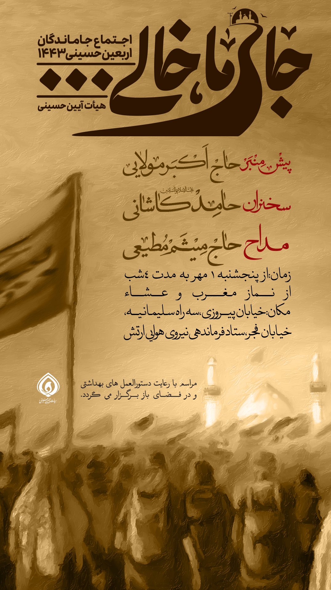 در این مراسم که از پنجشنبه اول مهرماه به مدت ۴ شب از نماز مغرب برگزار میشود، حاج اکبر مولایی پیش منبرخوانی، حجتالاسلام حامد کاشانی سخنرانی و حاج میثم مطیعی مرثیهخوانی خواهد کرد.